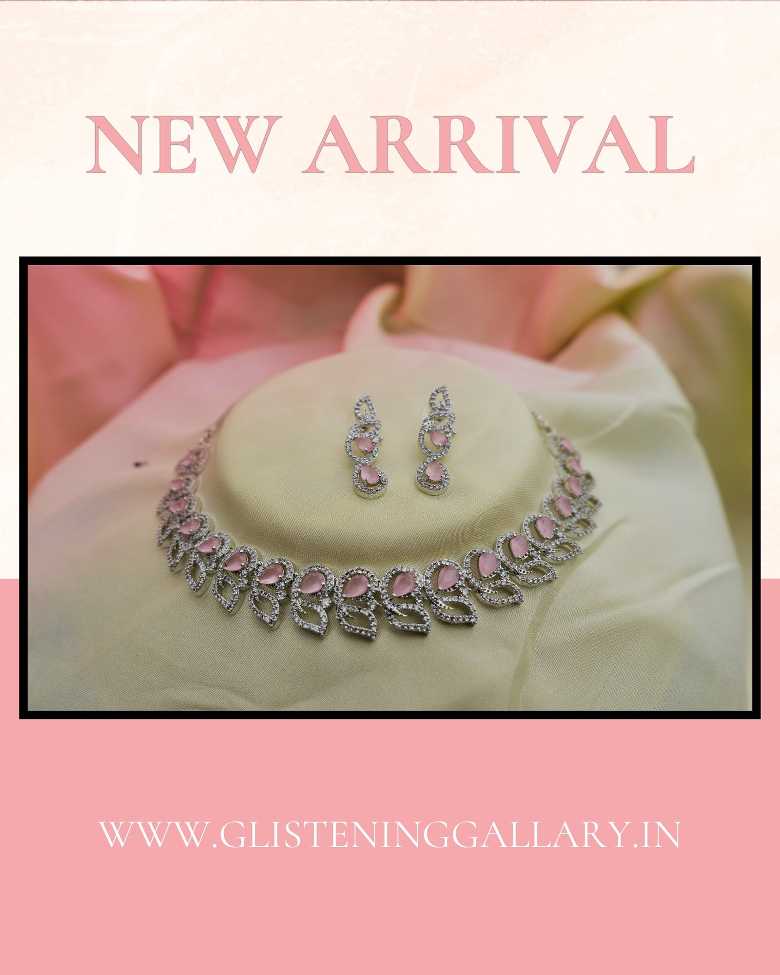 A delicately crafted necklace and earrings set adorned with soft blush-pink stones and graceful leaf-inspired detailing. Perfect for adding a romantic, feminine charm to weddings, festivities, and elegant occasions.