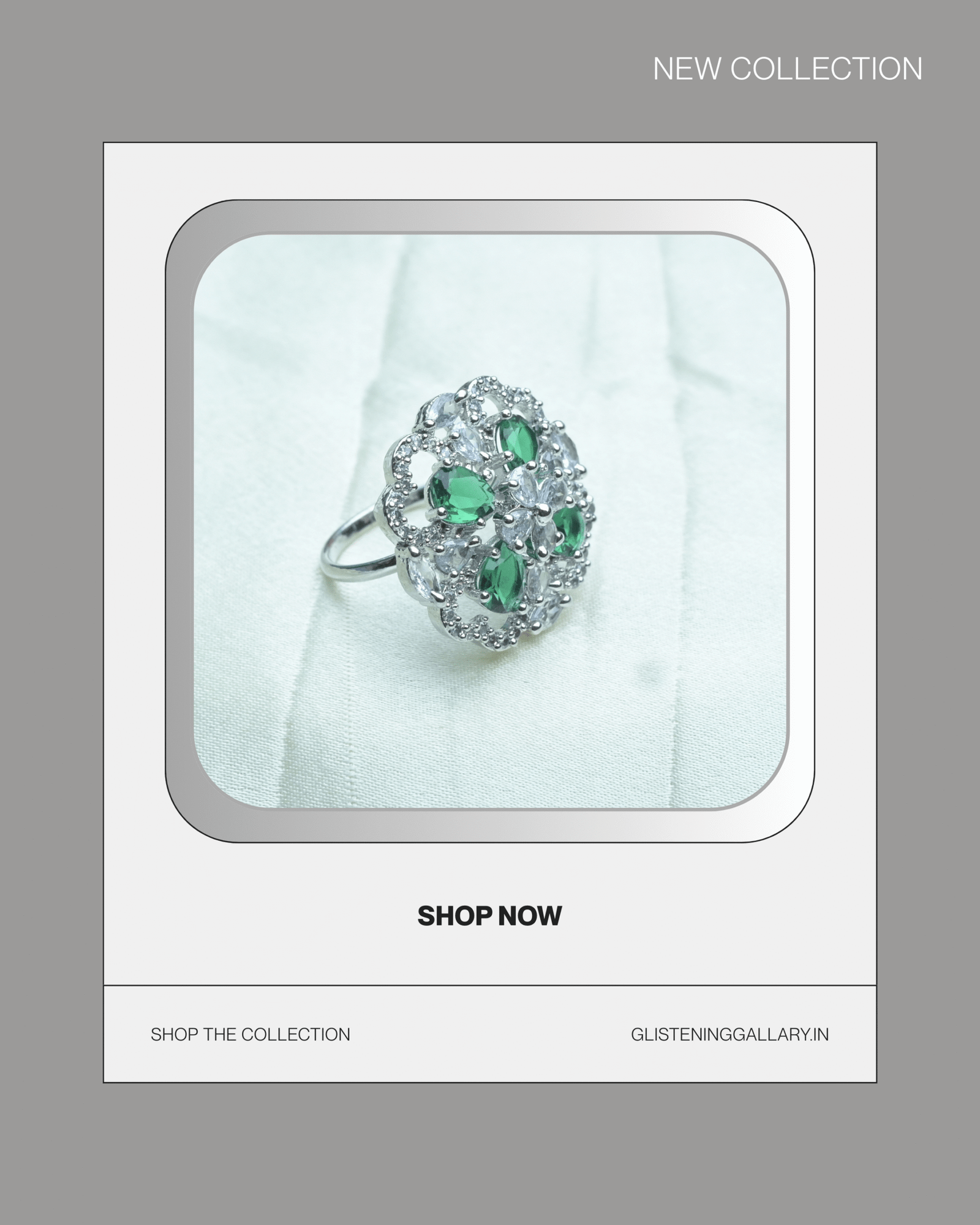 A graceful statement ring featuring a soft blush-pink center stone surrounded by radiant crystal halos. Designed for elegance, charm, and timeless beauty—perfect for weddings, festive occasions, and evening wear.