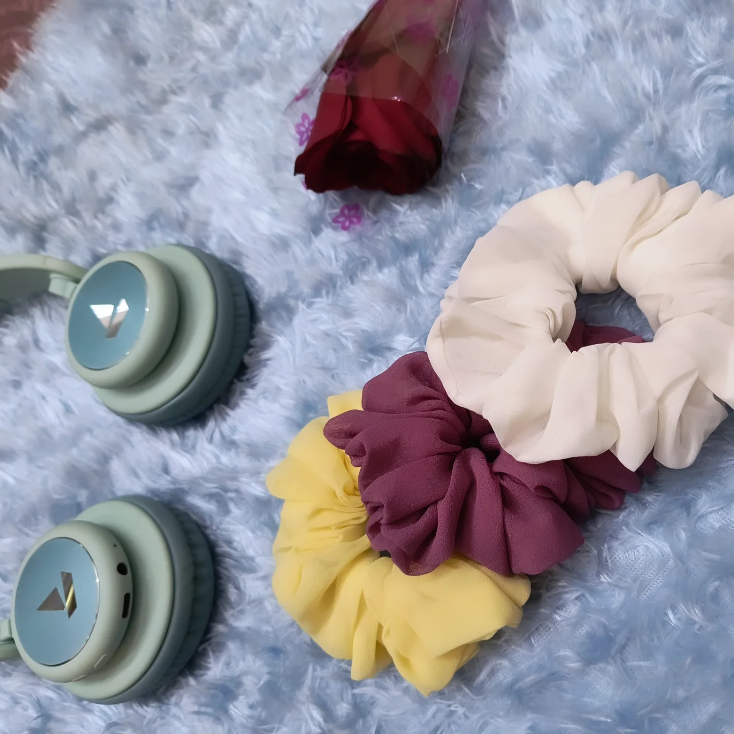 Style your hair effortlessly with this elegant trio of chiffon scrunchies in soft pastel shades. Lightweight and gentle on hair, they provide a secure hold without pulling or damage. Perfect for daily wear, casual looks, or adding a subtle pop of color to your hairstyle.