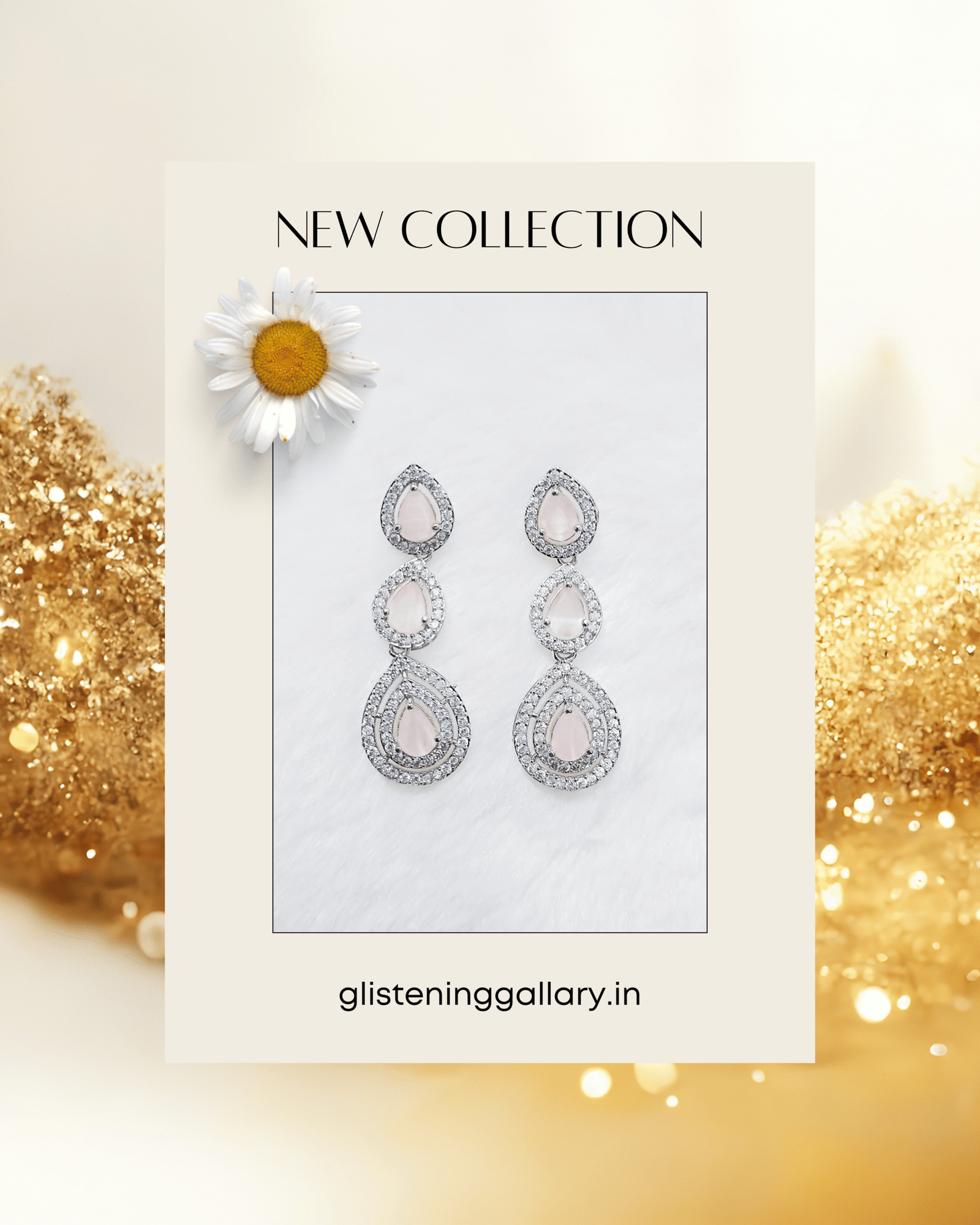 Make a statement with these elegant dangler earrings, crafted with soft pink teardrop stones set in a stunning double-layered crystal frame. The graceful design flows from a small teardrop stud to a larger drop, creating a timeless and eye-catching effect. Perfect for weddings, evening parties, or adding sparkle to any special occasion.