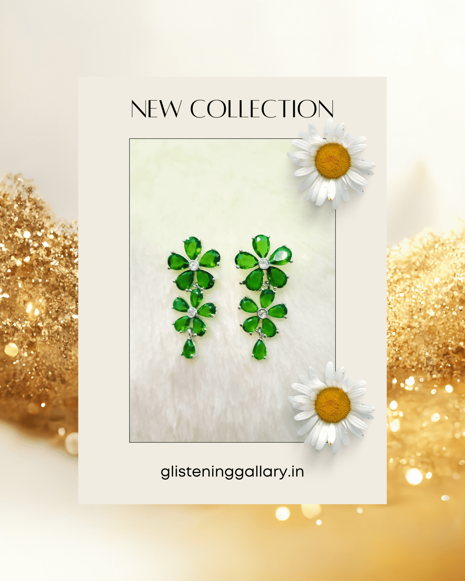 Celebrate the freshness of nature with our Emerald Bloom Drop Earrings. Designed with precision, these earrings feature twin floral clusters made of sparkling green stones, centered with a shimmering white crystal. The cascading design adds a graceful drop effect that complements both ethnic and western outfits.