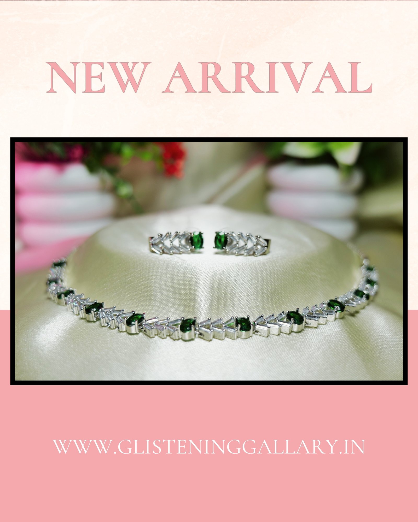 Make a statement with this elegant emerald necklace set crafted in a sleek silver-tone finish. The finely set emerald-green stones are paired with sparkling diamond-style accents, creating a perfect balance of luxury and sophistication. Designed to sit gracefully on the neckline, the set comes with matching stud earrings, making it ideal for both special occasions and premium party wear.
