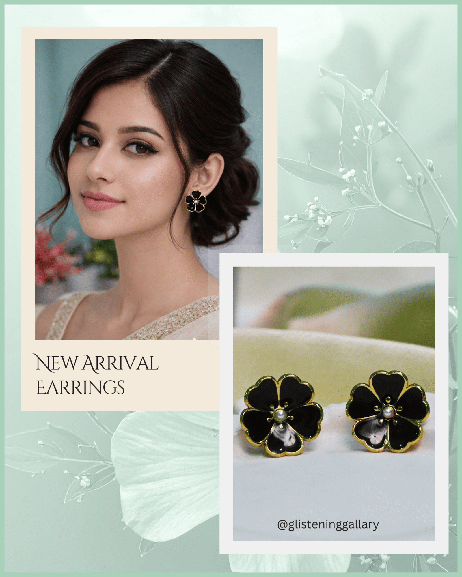These stylish flower-shaped earrings feature a glossy black enamel finish with a refined golden outline and a delicate center detail. Lightweight and comfortable, they are perfect for daily wear as well as parties, festive functions, and evening outings. A must-have accessory that pairs beautifully with ethnic, western, and fusion outfits.